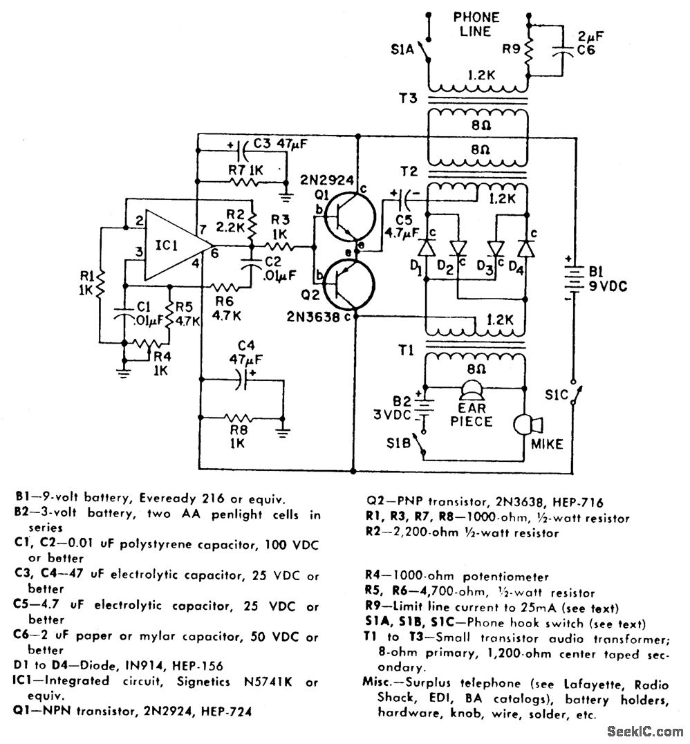 IC-1 and the associated circuitry form a stable audio tone generator that feeds a buffer amplifier, Q1 and Q2. The tone output is taken from the emitters of the transistor pair to supply a carrier voltage for a balanced modulator made up of four diodes-Dl through D4-and T1 and T2. If the two transformers and the four diodes are perfectly matched (which is almost impossible to achieve and not necessary in any case) no carrier will appear at the input or output of T1 or T2. In a practical circuit, a small amount of unbalance will occur and produce a low-level carrier tone at the input and output of the balanced modulator. A telephone carbon mike and earpiece are connected to the low impedance winding of T1, with a three volt battery supplying the necessary mike current.Trim potentiometer R4 is used to make a fine frequency adjustment of the oscillator so that two scrambler units may be synchronized to the same carrier frequency. Rg limits,line current to 25 mA.