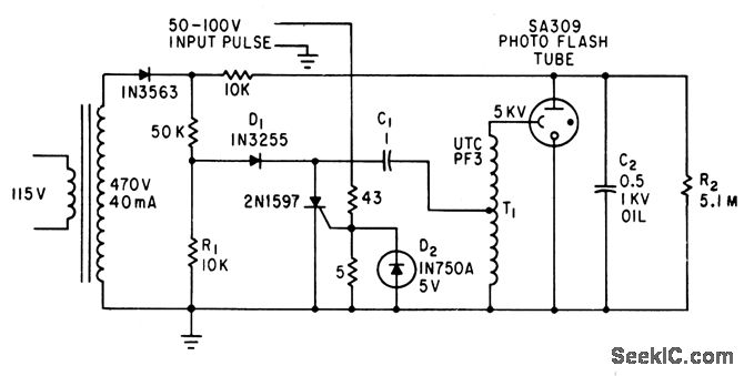 C1 is charged to 100 v by ac power supply. Input trigger pulse fires 2N1597 scr to make C1 discharge through primary of T1. Peak of 5 kv in secondary triggers photoflash. Maximum repetition rate is 20 flashes per second.-E. L. Harris, Jr., Solid ,State Components Shrink Photoflash Control, Electronics, 36:15, p 70.