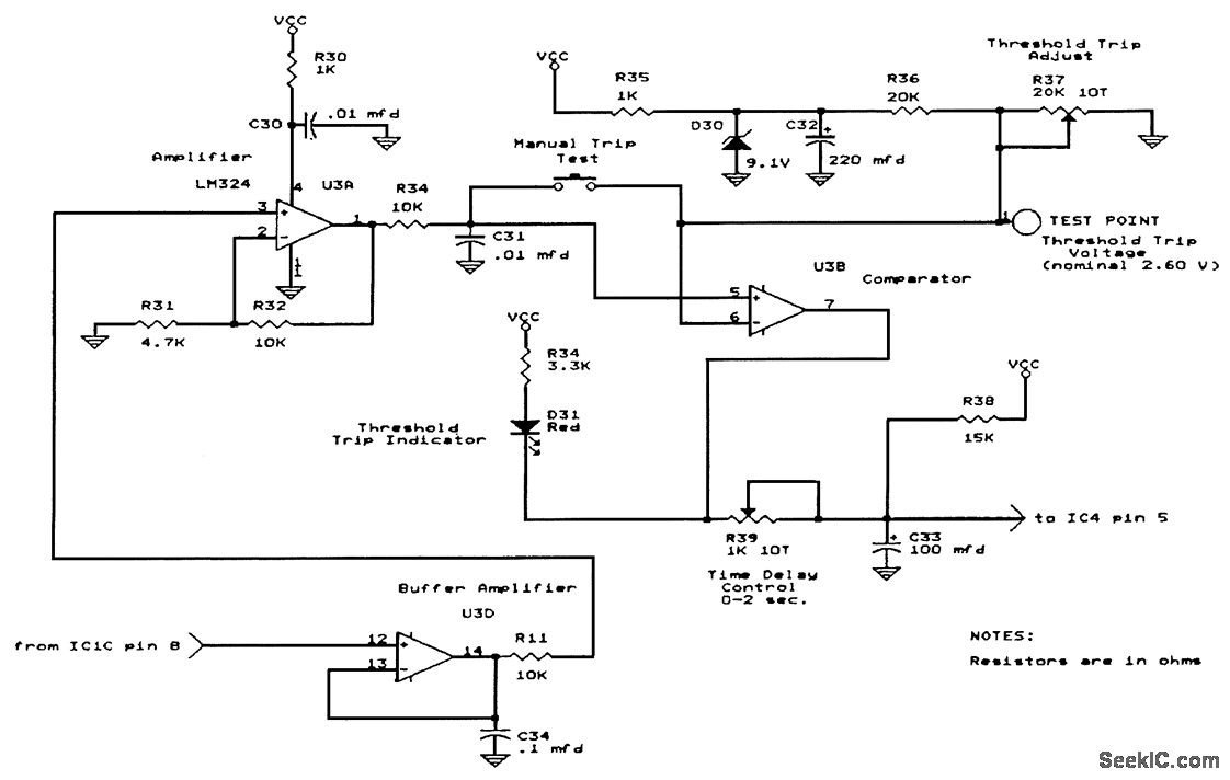 This threshold circuit is fed by a geophone amplifier and is actuated by seismic activity, as picked up by a geophone. The threshold is adjustable.