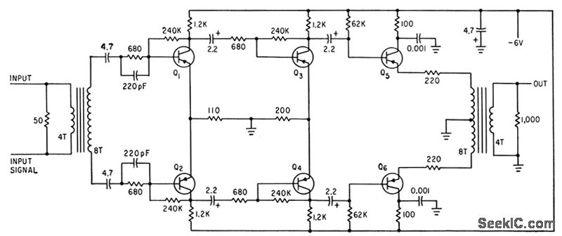 Small signals stored in thin-film momory are amplinfied while rejecting noise from partially selecled bits on same sense line. Circuit is completely isolated differential amplifier operating from low-impedance source.-A.A.Fleischer and E.Johnson, New Digital Conversion Method Provides Nanosecond Resolution, Electronics, 36:18, p55-57.