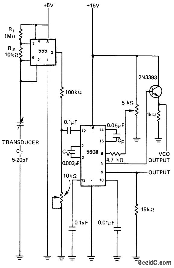 Capacitive transducer of type used for measuring displacement and pressure is used to modulate 555 MVBR. Frequency is detected in NE560B PLL that produces DC output voltage. CF sets bandwidth of demodulated information. Zero-position frequency of transducer is measured at pin 12 of PLL, and VCO frequency of PLL is measured from pin 5 through 2N3393 emitter-follower stage.-R. M. Wise, Capacitive Transducer Senses Tension in Muscle Fibers, Electronics, June 26, 1975, p 97; reprinted in Circuits for Electronics Engineers, Electronics, 1977, p 349.