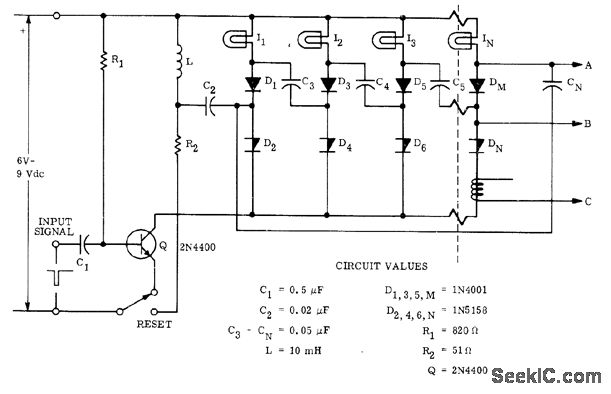 Ring counter using four-layer diodes DN provides sequential switching of loads under control of input pulse-train signal. Indicator lamps are shown, but any load from 15 to 200 mA can be switched. After power is applied, reset switch must be pressed to establish current through L.When switch is released, this current fiows through C2 and breaks down D2, allowing current to flow through first lamp I1. Input pulse to transistol Q (normally held off by current through R1)turns Q off and removes power from diode circuits, thus turning I1 and D2 off. At end of input pulse, a comes on and restores power to diode circuits, but all loads will be turned off.Voltage on C3 now adds to 6 V normally across D4, making D4 break down and turn on I2. Next input pulse will breakdown D6 in same manner.Output signals may be picked up as negative pulses at A or B or by current-sensing at C if required for controlling larger loads,-J. Bliss and D. Zinder, 4-Layer and Current-Limiter Diodes Reduce Circuit Cost and Comptexity, Motorola, Phoenix, AZ, 1974, AN-221, p 5.