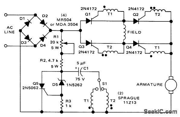 Provides both direction and speed control for fractional-horsepower series-wound or universal DC motors as long as motor current requirements are within SCR ratings. Q1-Q4, connected in bridge, are triggered in diagonal pairs. S1 determines which pair is turned on, to provide direction control. Pulse circuit is used to drive SCRs through T1 or T2. When C1 charges to break-down voltage of zener Q5, zener passes current to gate of SCR Q5 and turns it on. This discharges C1 through T1 or T2 to create desired triggering pulse. Q5 stays on for duration of half-cycle. R1 controls motor speed by changing time required to charge C1, thereby changing conduction angle of Q1-Q4 or Q2-Q3.- Direction and Speed Control for Series, Universal and Shunt Motors, Motorola, Phoenix, AZ, 1976, AN-443.