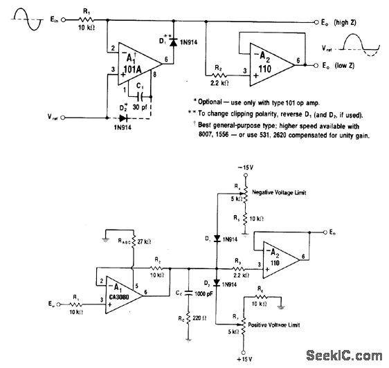 When input voltage is above reference voltage, D1 is reverse-biased and input voltage passes through R1 to output.When negative peak of Ein exceeds Vref, opamp A1 turns D1 on to absorb input current from R1, thereby clamping output at level of Vref. If low output impedance is required, use 110 highspeed voltage follower as buffer amplifier.-W.G. Jung, IC Op-Amp Cookbook, Howard W.Sams, Indianapolis, IN, 1974, p 189-190.