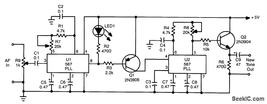 This circuit takes audio from a receiver that might have a weak CW or tone signal and uses a PLL (U1) to recover the weak signal. U1 produces a low on receipt of a tone or note of frequency, determined by R1, R7, and C2. The output of U1 (pin 8) goes low, keys tone generator U2, and produces a new tone. The circuit is useful in cleaning up CW reception in static. noise. etc.