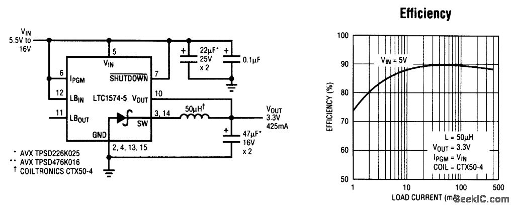 In portable logic systems requiring mixed 5-V and 3.3-V supplies, space and efficiency are paramount. Enter the LTC1574-3.3, a small and simple solution that provides over 90 percent efficiency.The LTC1574-3.3 features an intemal Schottky diode, reducing the external component count to just three parts. This high-efficiency circuit uses all surface-mount components, and employs Burst Mode operation to extend high efficiency to low current levels (see graph). A low-loss internal power MOSFET (RDS = 1.2 Ω is typical for this circuit) switch and constant off-time architecture are key in achieving this high efficiency. The LTC1574 can be shut down, limiting the supply current to 25 μA (max).