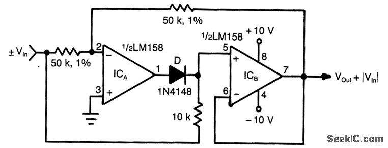 When an input voltage is positive, the output of ICA is negative and diode D does not conduct; hence the output of ICB is positive. On the other hand, when the input is negative, the output of ICA is positive.D will conduct and cause the absolute value, expressed as a positive voltage, to appear on the noninverting input of ICB and on the circuit's output.