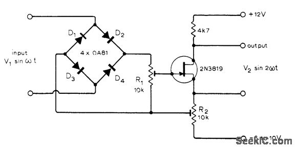 Performance is good up to about 10 kHz. R2 is adjusted to set FET just at cutoff under no-signal conditions, to give operation in square-law region. With R1correctly adjusted, using scope or third harmonic distortion monitor to obtain minimal distoltion, harmonic content of output can be made to approach that of sine-wave input. Article gives design equations.-R. Williams and J. Dunne, Frequency Doubler, Wireless World, Dec. 1975, p 575.