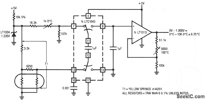 The thermistor network specified eliminates the need for a linearity trim-at the expense of accuracy and operational range.