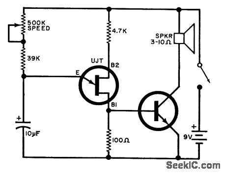 Adjustable from 15 to 240 beats per minute. The UJT oscillator output is applied to a general purpose npn transistor which drives the speaker.UJT=2N4871NPNxistor=TIP31