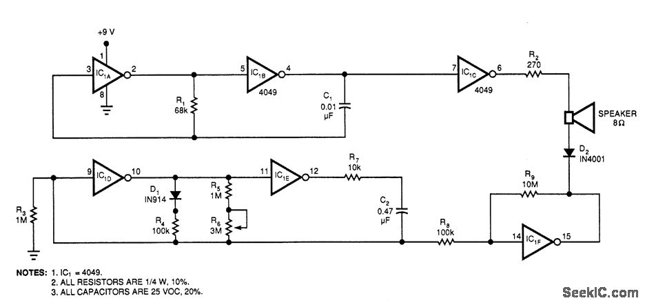 This circuit uses only one IC, produces a pleasant tone, and sports a single control for adjusting the tone's chiming rate. IC1A and IC1B form an astable multi ibrator, which produces the circuit's basic tone. The multivibrator's frequency is:The component values produce a 668-Hz tone. IC1C buffers the multivibrator's output to the 8- Ω speaker. Current-limiting resistor R2, determines the speaker's volume. R2 minimum value is 220 Ω. IC1D and IC1E form an asymmetric, astable multivibrator, which adds a chime effect to the circuit's basic tone. The chime effect's frequency is:R7 gives this rate multivibrator a slowly varying output signal to produce a pleasant decay for the chime effect. IC1F is an inverting amplifier for the chime multivibrator.