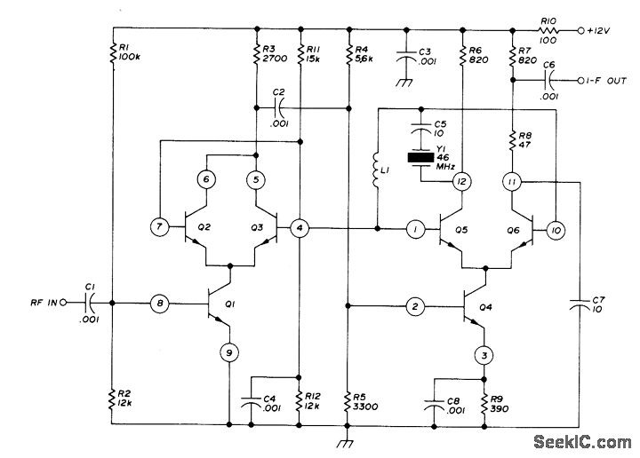 Covers all VHF amateur bands by using mixer-generated harmonics of 66-MHz crystal oscillator frequency for mixing action. IF can be tuned with any communication receiver. Fundamental is used directly, third harmonic of 138 MHz serves for 2 meters, fifth of 230 MHz for 220-MHz band, and ninth of 414 MHz for 420-MHz band. Q1-Q3 are broadband RF preamp. Y1 is plated overtone crystal oscillating at 46 MHz in series-resonant mode. Q5 and Q6 form differential-amplifier oscillator, and Q4 is mixer driver. No tuning is required in converter, but external tuning is required to prevent device from working on all bands at once. All transistors are part of RCA CA3049T IC, for which pin numbers are circled. L1 is 72 inches of No. 30 enamel, doubled and twisted 1 turn per inch and wound on 1-meg-ohm 1/2-W resistor to form quarter-wave trans-mission line. -S. Smith, Four-Band VHF Receiving Converter, Ham Radio, Oct. 1976, p 64-66.