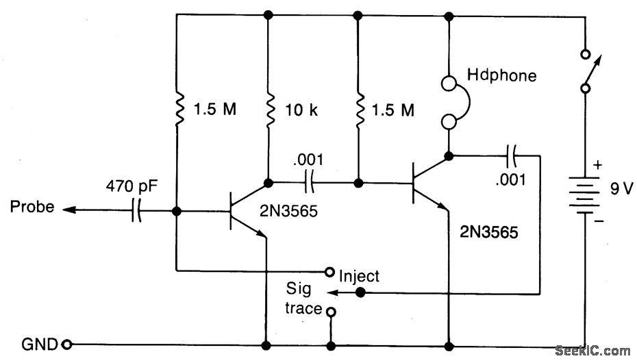 Circuit NotesThis circuit will provide a nominal square wave output in the audio range in the Inject mode, the harmonics of which should be heard at several MHz. In the Trace mode the non-linear operation of the amplifter will detect modulated rf signals which will be filtered by the.0.01μF capacitor and heard in the headphones.
