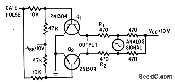 Two transistors act as balanced shorting switch, eliminating pedestal effects that normally necessitate dual-polarity gate pulses for analog signal. Positive 10-V pulse saturates both transistors, thereby grounding both output terminals to give isolation from input signal. Analog signal being gated can be as low as 5-mv rms.-L. E. Frenzel, Jr., Gate Circuit Eliminates Pedestal Effects, Electronics, 37:15, p 77.