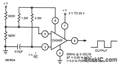 This multivibrator uses a CA3420 BiMOS op amp to provide improved frequency stability. The output frequency remains essentially independent of supply voltage. Because of the inherent buffering action of pin 6, frequency shift is approximately 0.2% when RL varies between zeroΩ to infinity.