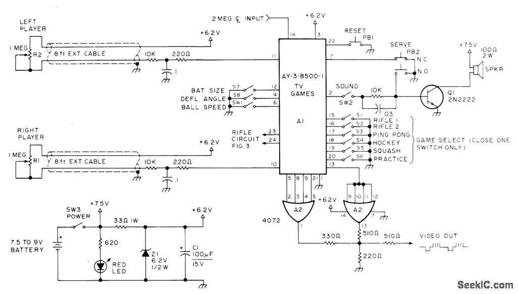 General Instruments AY-3-8500-1 TV game chip and associated circuits give choice of six different games. Article gives additional circuits required, including that for 2MHz master dock whose output is divided in chip to get vertical and horizontal syncfrequencies, VHF modulator used between game and antenna terminal of TV set, and rifle target practice clrcuit,All operate from battery suρply atlower left Article covers construction only ingeneral terms,-s,Ciarcia,Hey,Look What My Daddy Built!,73 Magazine.Oct, 1976,p 104-108