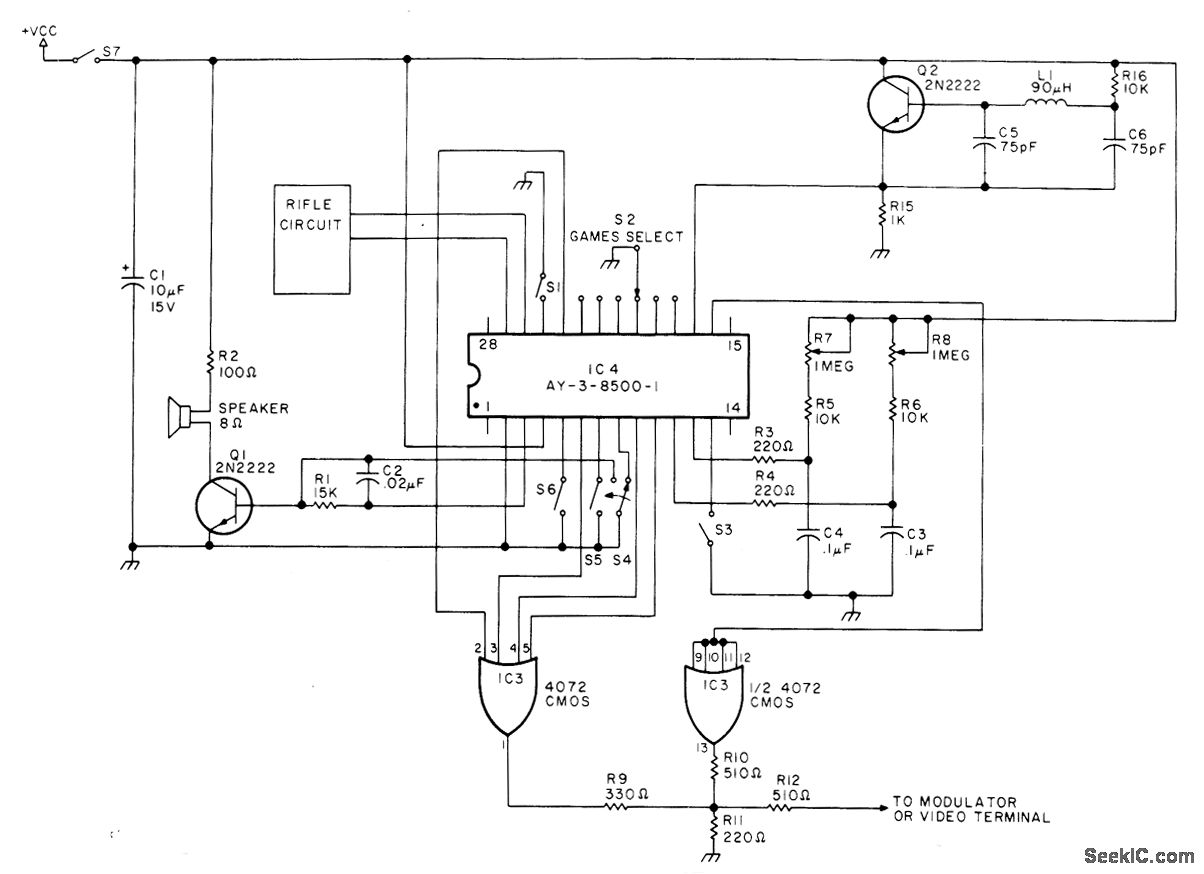 General Instruments AY-3-8500-1 MOS chip gives choice of hockey, squash, tennis, two types of rifle shoot, and practice games, all with sound effects and automatic scoring on 0-15 display at top of TV screen.Can be used with standard TV receiver (using RF modulator circuit) or with video monitor, S4 grounds base of Q1 when in manualserve mode, to eliminate steady boing when ball leaves playing field. R5-R8 position players on field.Article covers operation in detail and gives suitable rifle circuit. Supply is +6V. 2-MHz clock is at upper right.-A. Dorman, Six Games on a Chip, Kilobaud,Jan. 1977, p 130, 132, 134, 136, and 138.