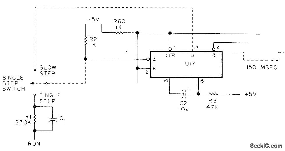 Addition of slow-stepping switch position to single-step circuit of micro.processor eliminates need for pushing single step switch repeatedly while executing endless loop program and watching address and data lights to see where program or hardware fails during debugging run. Circuit uses 74123 mono MVBR to give 1,5-ms pulses on single step and 150-ms on slow step.-H. R. Bendrot, The Slow-Stepping Debugger, Kilobaud, April 1977, p 60.