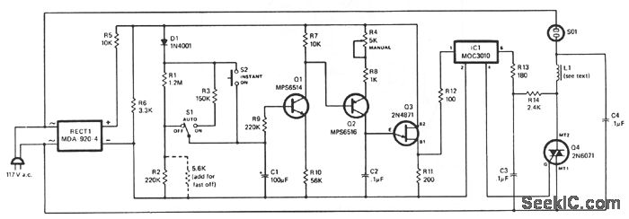 The dinuning action is controlled by varying the amount of current passed through triac Q4 and, thus, the lamp plugged into ac receptacle SOl. Unijunction transistor Q3 operates as a relaxation oscillator whose output pulse frequency depends on how fast capacitor C2 recharges after firing. Transistors Q1 and Q2 furnish the charging current, with the R3/C1 and RI/R2/C1 time-constant networks controlling the turn-on and turn-off times. Inside IC1 is a LED, a detector, and a small triac. In circuit, the low-level pulses coming from Q3 make the LED in IC1 emit short bursts of light that are picked up and converted into electrical current pulses by the internal detector. This small current triggers the internal triac, which then outputs the pulses to the gate of power triac Q4, triggering it on so that it delivers current to the lamp. Potentiometer R4 serves as a master control of the pulse rate and provides both manual control and a limit in the brightness of the lamp plugged into SO1. Momentarily pressing 52 causes the lamp to instantly turn on. Choke L1 suppresses any spikes produced by the power triac and limits interference with AM radio reception. No safeguards against interference need to be made for FM and TV reception, since these media are immune to this type of noise.