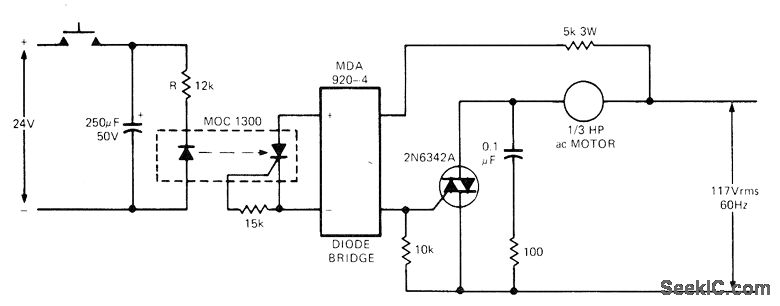 Designed for applications where machine must remain energized for certain period of time after some other operation has stopped, as when pump motor must run long enough to dear pipes in chemical plant. When switch is closed, LED of optoisolator is forward-biased and turned on, making photoGCR conduct and provide gate current via MDA920-4 diode bridge fortriac. Values shown keep solid-state relay circuit on for about 5 s after pushbutton is released. Resistor and capacitor values can be changed to obtain different delay.-T. Mazur, Solid-State Relays Offer New Solutions to Many Old Problems, EDN Magazine, Nov. 20, 1973, p 26-32.