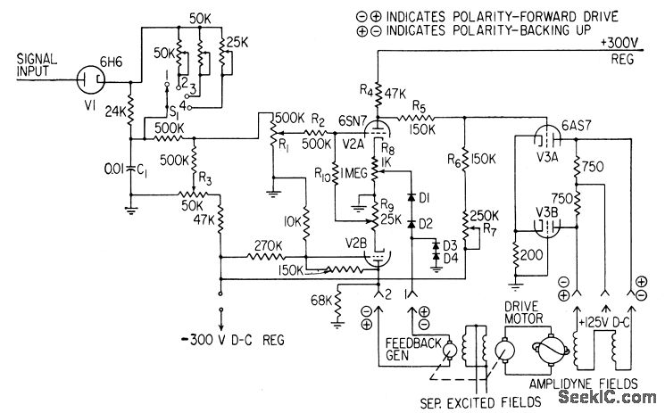 Posilioning information is derived from gap voltage, fed to integrating circuit through diode V1, and resuhing output fed through V2 to cath-ode-coupled push-pull d-c amplifier that excites field of amplidyne generator to move tool electrode toward or away from work-piece, as required to permit sparkover at voltage selected for machining conditions desired. Used chiefiy for work on high-tempemture alloys and otherwise unmachinoble materials.-E. M. Williams and C. P. Porterleld, Spark Machine Tool has Servo Control, Electronics,31:43,p90-92.