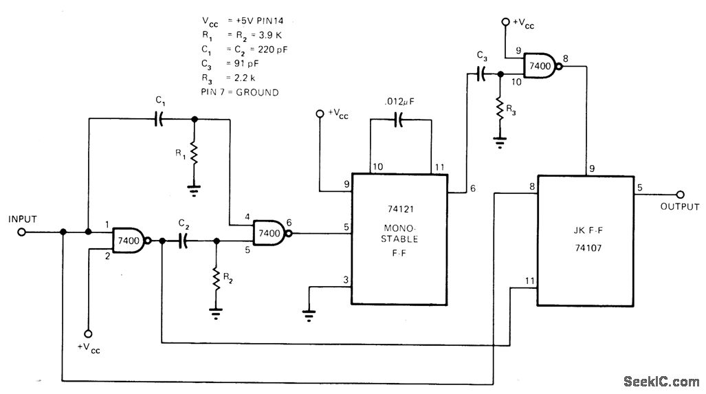 Used to eliminate noise that may be present on signal Iine. Based on sampling input Iine at fixed time after each detected transition. If transition was due to noise spike, spike will no longer be present and true signal level will be sampled. lf transition was caused by desired legitimate signal, sampled waveform represents true signal delayed by pulse width of mono MVBR. Mono pulse width is about 12μs. Article gives circuit waveforms and describes operation in detail.-A. S. Bozorth, Pulse Verification Yields Good Noise Immunity. EDN Magazine. Nov. 5. 1973. p 75 and 77.