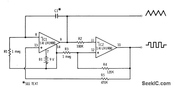 Two sections of LM3900 quad opamp are connected to generate dua-polarity triangle-and square-wave AF outputs while oρerating from single supply, byusing current mirror circuit at noninverting input Value used for C1 determines frequency and pulse width;frequency ranges from 0.5 Hz with 1 μF to 3800 Hz with 0.0001 μF and 21 kHzwith C1 omitted, Pulse-width rangeis 35μs without C1 to 1.6 s with 1 μF.-F.M Mims,″Integrated Circuit Projects,Vol.5,″Radio Shack,Fort Worth,TX,1977、2nd Ed. p 57-63