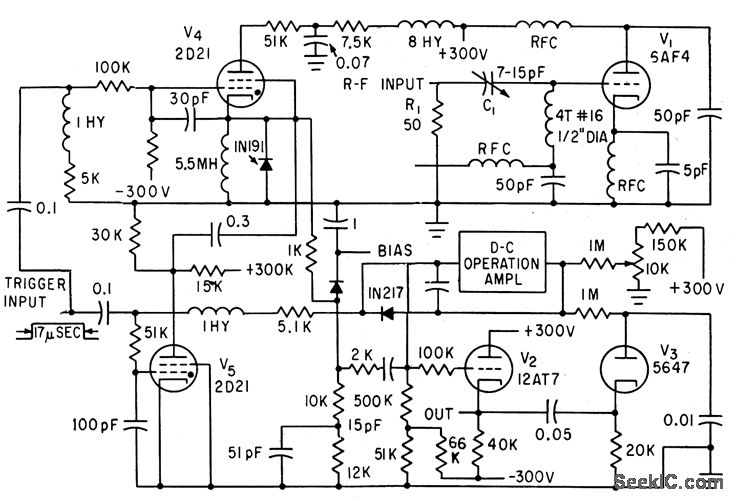 Agc circuit transforms grid-pulsed superregenerative am pliler V1 into noncritical circuit that is stable for long periods when controlled by pulse generator V4-V5, which in tum is controlled by extemal trigger pulse source.-J. H. Kuck, Automatk Gain Control for Superregenerative Amplifiers, Electronics, 34:29, p 76-79.