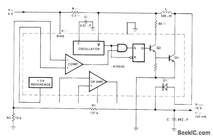 Fairchild μA78S40 switching regulator transforms 5 V to 15 V at efficiency of 80% for 150-mA load. Average input current is only 550 mA. Article gives de-sign equations.-R. J. Apfel and D. B. Jones, Universal Switching Regulator Diversifies Power Subsystem Applications, Computer Design, March 1978, p 103-112.