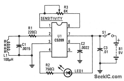 The CS209 is designed to detect the presence or proximity of magnetic metals. It has an internal oscillator that, along with its extemal lc resonant circuit, provides oscillations whose amplitude is dependent upon the Q of the lc network. Close proximity to magnetic material reduces the Q of the tuned circuit, thus the oscillations tend to decrease in amplitude. The decrease in amplitude is detected and used in tum on LED1, indicating the presence of a magnetic material (i.e., nail or screw).