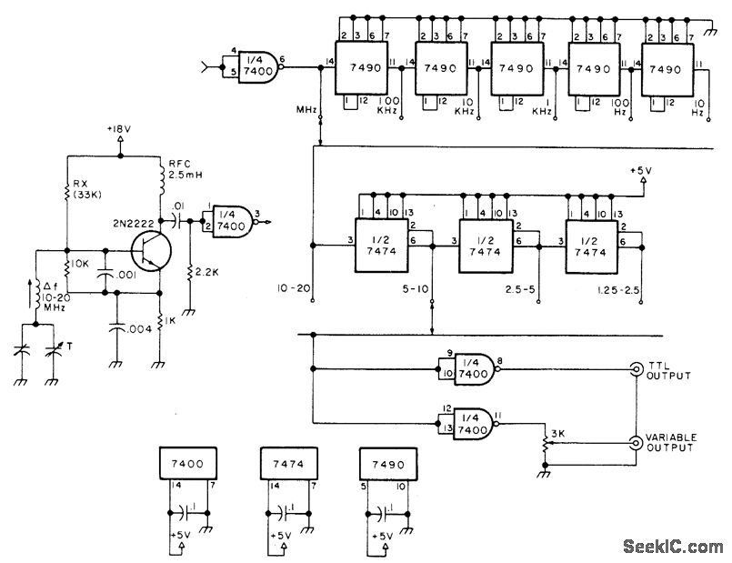Square-wave signal source covers wide frequency range in fully tunable decade steps, as TTL signal source for experimentation with counters, microprocessors, and other logic circuits. Uses tunable 2N2222 transistor oscillator operating at 10-20 MHz, with switchable decade dividers for range selection and switchable binary dividers for band selection. Article covers construction and calibration,-A. G. Evans, Digital Signal Source, 73 Magazine, Dec. 1977, p 150-151.