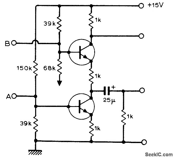 Simple circuit using two BC109 or equivalent transistors is effective for summing and differencing two signals, as required in stereo and quadraphonic sound applications. For resistor values shown, upper output is -1/2(A + B) and lower output is -1/2(A - B). Will handle input signals up to 1.4 V. Bottom of 68K resistor should go to ground.-B. J. Shelley, Active Sum and Difference Circuit, Wireless World, July 1974, p 239.