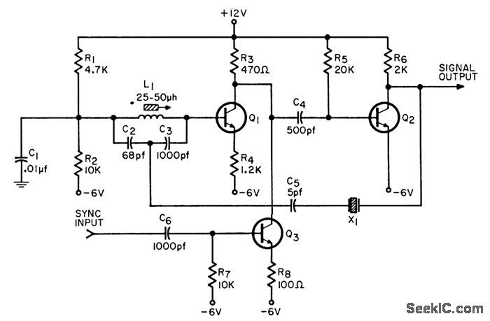 Synchronizes crystal-controlled tran of of 3.3-Mc clock pulses to unrelaled sync trigger having nominal repetition rate of 300 pulses per second, to provide constant delay between end of sync pulse and first clock pulse.-P. Danzer, Synchronized, Crystal-Controlled Oscillcator, EEE, 12:5, p90.