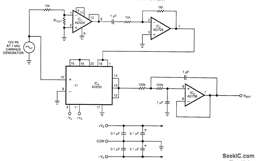 The circuit uses a synchronous-detection scheme to measure low-level resistances. Other low-resis-tance-measuring circuits sometimes inject unacceptable large currents into the system-under-test.This circuit synchronously demodulates the voltage drop across the system-under-test and can hence use extremely low currents while measuring resistance.The 10-V (pk), 1-kHz carrier generator injects a 1-mA reference current into unknown resistor, RTEST. Instrument amplifier IC1 and precision op amp IC2A amplify the voltage across RTEST by a gain of 100000. Synchronous detector IC3 demodulates this voltage, then op amp IC2B acts a low-pass filter on the demodulated voltage. The low-pass filtering will attenuate all uncorrelated disturbances (such as noise, drift, or offsets), while passing a dc voltage that is proportional to the unknown resistance.