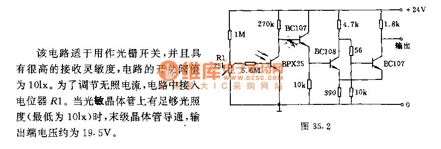 This circuit is adapted to be used as a grating switch with a high receiver sensitivity, the circuit switching threshold is 10Lx. In order to adjust the dark current, the circuit connects with potentiometer R1; when there is sufficient light intensity on phototransistor ( the lowest bit is 10Lx ), the last stage transistor turns on, the output voltage is about 19.5V.