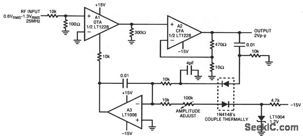 This circuit stabilizes the amplitude of an RF signal against variations in input, time, and temperature. A1 (an OTA, chapter 11) feeds current-feedback amplifier A2. The A2 output is sampled by the A3-biased gain-control configura-tion. The 4-pF capacitor compensates rectifier diode capacitance, which enhances output flatness versus frequency. The A1 ISET input current controls A1 gain, and allows overall output-level control.