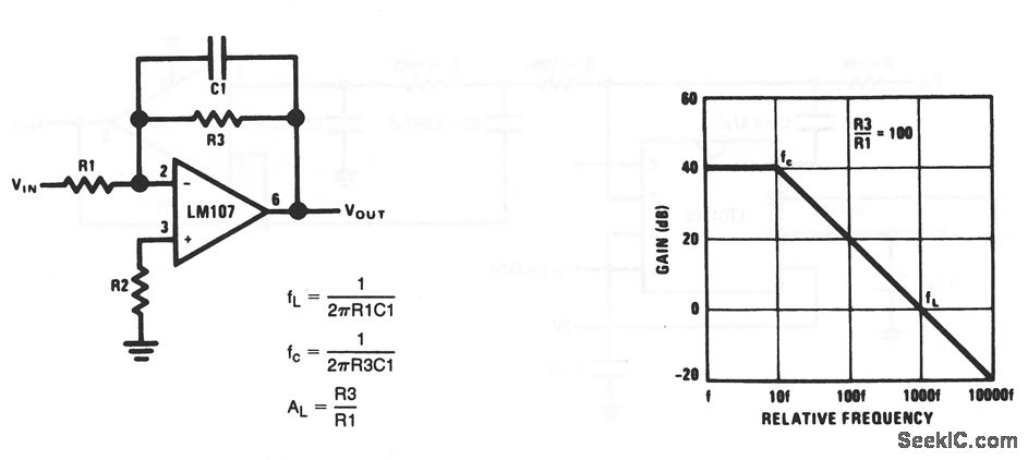 This circuit has a 6-dB per octave rolloff, after a closed-loop 3-dB point that is defined by fc(Fig. 7-41B). Gain below the fc corner frequency is defined by the ratio of R3 to R1. The circuit can be considered as an integrator at frequencies well above fc. However, the time-domain response is that of a single RC, rather than an integral. R2 should be chosen equal to the parallel combination of R1 and R3 to minimize bias-current errors. The op amp should be compensated for unity-gain, or an internally compensated op amp should be used. National Semiconductor, Linear Applications Handbook, 1991, p. 23, 24.
