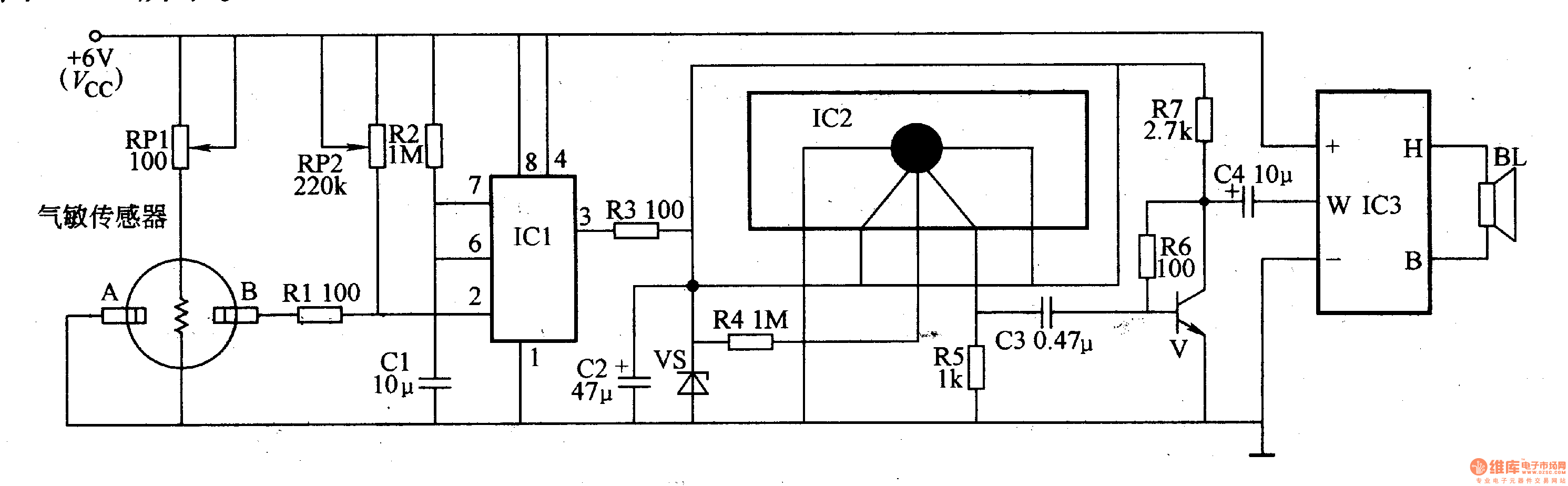 The audio power amplifier circuit is composed of transistor V, boost power amplification module IC3, resistors R6, R7, capacitors C3, C4 and loudspeaker BL.
