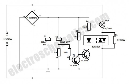 This simple 12 volt halogen lamp soft starter circuit extends the life of the halogen lamps by eliminating the sharp rise in the temperature of the filament; when the filament in cold it has a very low resistance.