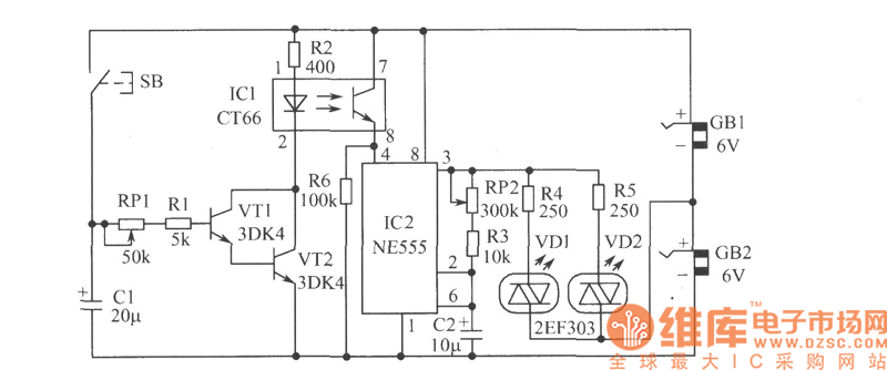The owl circuit is shown as the chart, starting the reclosing button will make electronic owl's eyes immediately turn between red and green alternately. After a period of delay, the end result is that electronic owl is automatically transferred to rest as work fatigue . Components Selection: IC1 uses CT66 8-pin photocoupler manifold, which has two sets of optical couplers, the practical application only selects one group. IC2 can choose NE555, FD555, 5G555 and other types of time-base integrated circuits. VT1, VT2 select NPN silicon transistors, the available models are: 3DG6, 3DG8, 3DG12, 3DK2, 3DG182, 9013, etc., β can be greater than 50. VD1, VD2 use 2EF303 color light emitting diodes. All resistors used in the circuit choose (1 / 8) W metal film resistors.