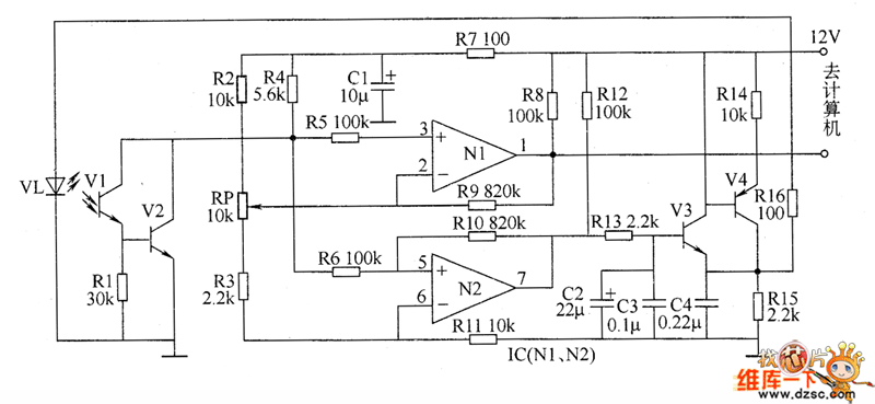 The spinner Weft feelers circuit consists of the optical signal amplifier and LED driver circuit, the circuit is shown as the chart. Optical signal detection amplifier circuit is composed of the infrared phototransistors V1 and V2, resistors R2 ~ R5 and R7 ~ R9, potentiometer RP, capacitor C1 and the N1 which is inside of the operational amplifier integrated circuit IC (N1, N2). LED driver circuit is composed of infrared light-emitting diode VL, transistors V3, V4, resistor sR2 ~ R4, R6, R10 ~ R16, potentiometer RP, capacitors C2 ~ C4 and the op amp N2 which is inside of the IC. R1 ~ R15 select 1/4W metal film resistors; R16 uses 1W metal resistor. RP uses small synthetic carbon potentiometer or variable resistor.