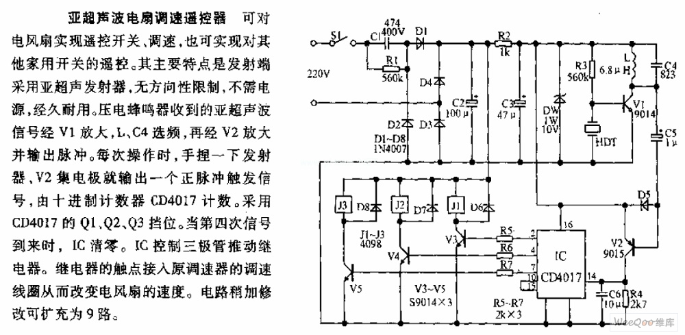 Sub-ultrasonic fan speed regulating controller can control the switch and speed of the fan, and it also can control the other appliances. The emitting end applies the sub-ultrasonic emitter, which is the main feature of this device. It also has no limitation about direction, and it is durable and do not need power source. The sub-ultrasonic received by the piezoelectric buzzer is amplified by V1, frequency selected by L, C4, and then amplified by V2m. it outputs pulse. You can mold the emitter when operating. The collector V2 will output a positive pulse triggering signal which is counted by the decimalism counter CD4017. It applies the Q1, Q2, Q3 gears of CD4017.
