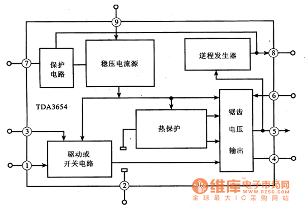 The maximum output current of the TDA3654 integrated circuit is 2.2Ap-p, the maximum output power is 15W. The internal circuit block diagram is as shown in figure 1. This IC can be directly used as the substitute of the TDA3653B and TDA3653C.