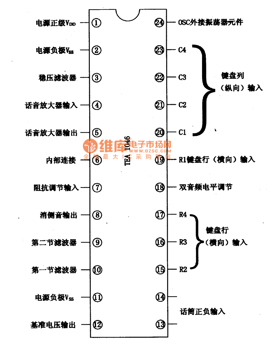 TEA1046 dual audio transmission integrated circuit is used in communication equipment for dual tone dialing and voice signal processing. 1. Features TEA1046 integrated circuit contains two-tone dialing signal generator, signal encoding and decoding circuit switching keyboard, voice amplifier, anti-side tone circuit, reference voltage regulator circuit, and other functional circuis. 2. pin function TEA1046 IC uses 24-pin dual in-line package, and the integrated circuit functions are shown in Figure 1-1.