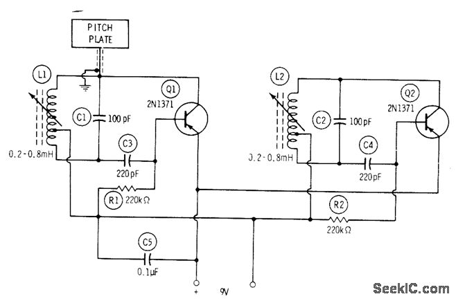 Two transistor oscillator stages generate separate low-power RF signal in broadcast band, for pickup by AM broadcast receiver. Movement of hand toward or away from metal pitch plate varies trequency of Q1, making audio output of receiver vary conespondingly as beat frequency changes. Both circuits are Hartley oscillators, using Miner 9012 or equivalent slug-tuned colls. To adjust initially, place next to radio and set tuning slug of L1 about two-thirds out of its winding. Set slug of L2 about one-third out of its winding. Tune radio until either oscillator signal is heard. Signal can be identified by whistle if on top of broadcast station or by quieting of background noise if between stations. Adjust slugs so whistle is heard at desired location ot quieting signal. Pitch of whistleshould change now ashand is brought near pitch plate.-J. P Shields, How to Build Proximity Detectors & Metal Locators, Howard W. Sams, Indianapolis, IN, 2nd Ed. 1972. p 154-156.