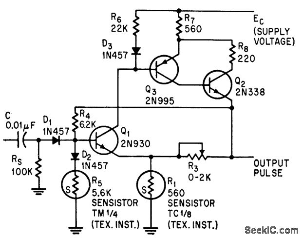 Accurate pulse periods of 15 sec to 2 minutes are produced by thermal mono using silicon resistor (Sensistor) whose resistance varies with temperature, power, and time. Used as timer to turn on plate supply 30 sec after filament supply.-L. L. Kleinberg, Sensistor Produces Long, Reliable Pulses, Electronics, 37:31, p 51-52.