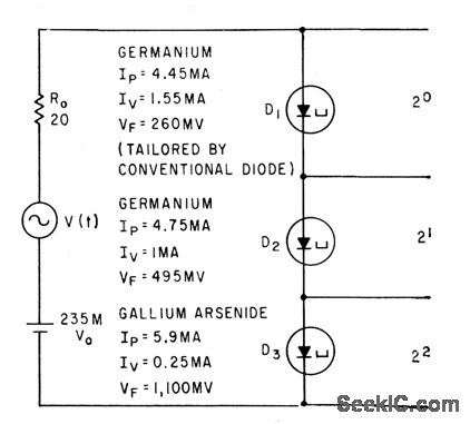 Three different tunnel diodes, each switching at a different input voltage level, act together to convert analog input voltage to digital form.-B. Rabinovici and J. Klapper, Designing Tunnel-Diode Circuits Using Composite Char-acteristics, Electronics, 35:7,p 46-48.