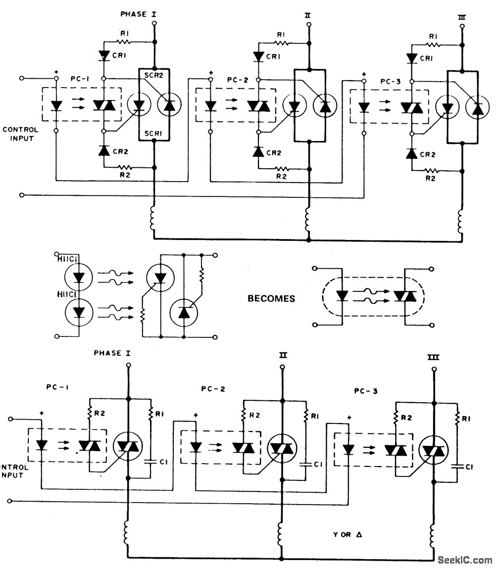 The following are three-phase switches for low voltage. Higher currents can be ob-tained by using inverse parallel SCRs which would be triggered as shown. To simplify the following schematics and facilitate easy understanding of the principles involved, the following schematic substitution is used (Note the triac driver is of limited use at 3 φ voltage levels).