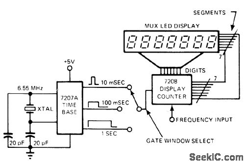 Intersil 7207A crystal-controlled timer generates precision gate windows of10 ms,100 ms, and 1 s for use as time bases, calibration markers, or gate timerns for frequency counters such as 7208.-B.O'Neil, IC Timers-the Old Reliable 555 Has Company, EDN Magazine, Sept. 5, 1977, p 89-93.