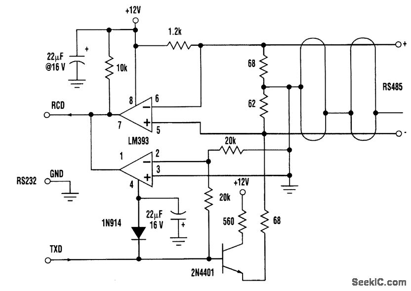This circuit needs only a minimal three-wire RS232 implementation plus one +10-to +15-V supply voltage to provide a transparent link capable of sending data at transmission rates up to tens of kbaud Circuit operation is as follows∶When both the 232 and the 485 are idle(232 port in MARK state and no 485 device active),the 485 link is held in the 1 state by the 1200-Ω pullup This causesthe top comparator to hold the 232 RCD line negative and therefore in MARK state When a character is transmitted by the 232 port,it begins with a positive-going (SPACE state) START bit on the TXD line,In response, the 2N4401 pulls the - 485 conductor more positive than the + wlre,thustransmitting the START down the 485 cable Meanwhile,the bottom comparator holds the wlre-or (LM393s have opencollector outputs)232 RCD low, blocking the ooodJt port from hearing its own transmission.The recelve side ofthe 232 port remalns idle The rest ofthe bits ofthe character follow along in the same fashion When a character originates somewhere along the 485 bus,it beginswith a 485 transceiver gong active and driving the - line above the + This causes the upper half of the LM393 comparator to release RCD,and this time the bottom comparator doesn't prevent it from being pulled high The data bits are thus allowed to arrlve at the RS232 port,where they appearat standard RS232 bipolar voltage levels,The commonmode voltage range and noise-rejection capabilities of this circuit are compatible with standard 485 specifications The converter's speed is mainly limited by the loading of the comparator outputs because of cable capacitance.